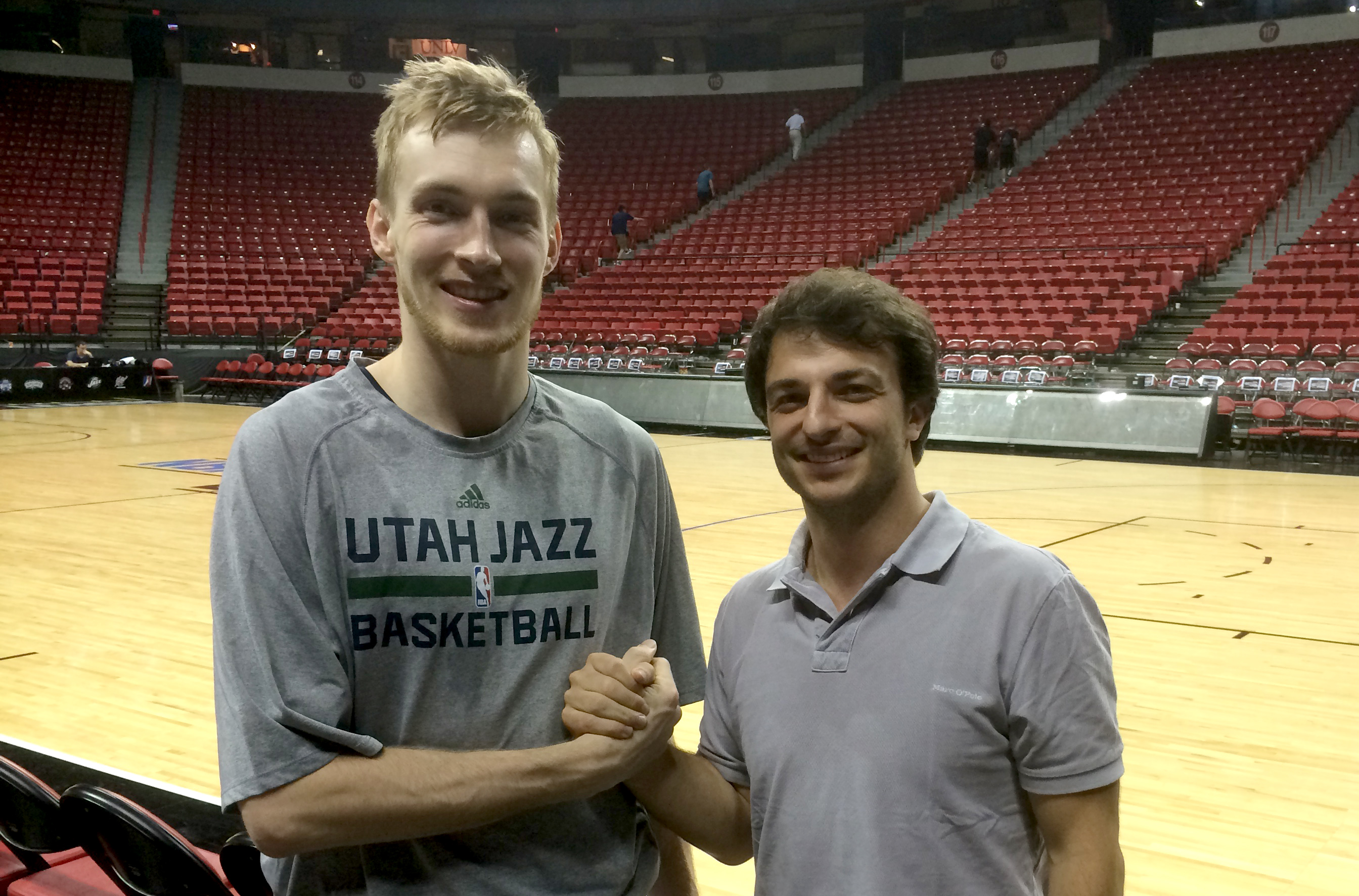 Niels Giffey has returned to the capital of soccer and schnitzel, inking a 3 year deal with German club Alba Berlin. Giffey had competed for Alba at the junior level from 2008-10 before becoming a two-time National Champion at the University of Connecticut. Following the 2014 National Championship, Giffey went undrafted before joining the Memphis Grizzlies summer league team in early July. After a disappointing stretch that saw no playing time, Giffey bolted to Vegas, suiting up for the Utah Jazz. It was in Vegas Giffey reached terms with Alba sporting director Mithat Demirel (pictured above) who was in town scouting. Although the terms of the deal have not been released, it would be fair to assume Giffey negotiated an out-clause allowing him to opt out and sign with a NBA team if the opportunity presented itself.